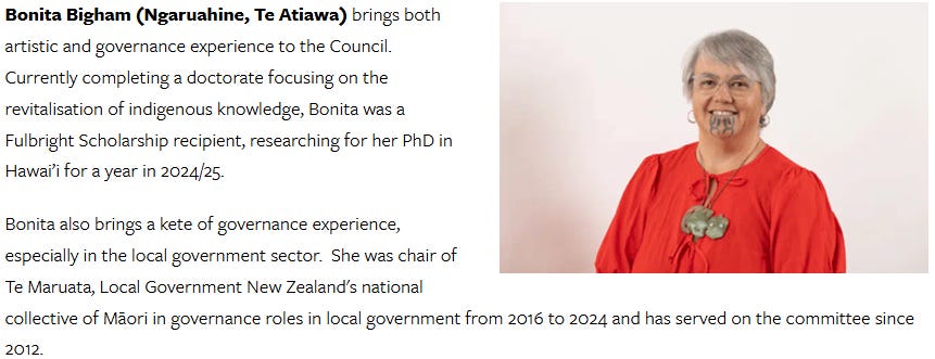Creative New Zealand is a farcically Leftist, post-modernist, racialized outfit. According to its website, “Our vision is that the arts and ngā toi Māori [Māori arts and crafts] are flourishing”. Creative NZ’s Council is an absolute hot bed of Critical Race Theorists and Cultural Elite Karens: