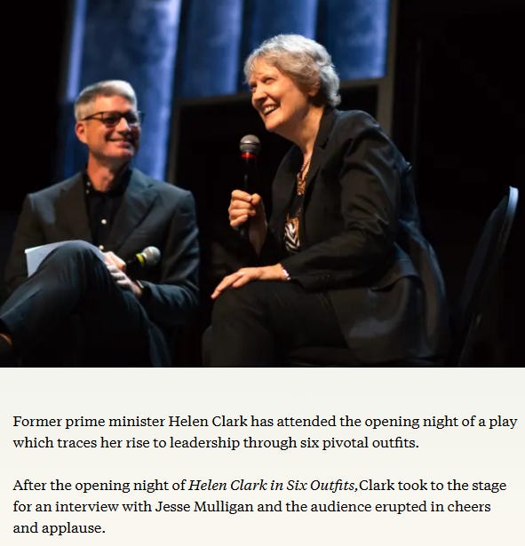 Helen Clark in Six Outfits is not a concert, but there’s concerted effort. We have Creative TV working with Helen Clark and Radio New Zealand (represented by Jesse Mulligan) to produce pro-Labour agitprop, all in an election year.