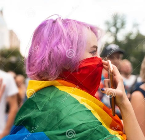 Closely associated with virtue signaling is the face mask as a badge of group solidarity and collective self-styled Woke vulnerability. The LGBTQ+ Brigade are stereotypical of this motivation for mask wearing, which is now an almost compulsory part of an official LGBTQ+ uniform.