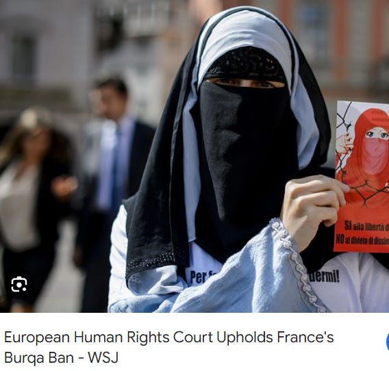 The French haven’t mucked around in dealing with the shady and/or misguided motivations for covering one’s face in public. In 2010, the French Parliament banned the wearing of face-covering headgear. Islamists and non-Muslim Islamophiles predictably claimed that the ban discriminated against Muslim women who are forced or cowed into wearing burqas and niqabs (a burqa covers all the wearer woman’s whole body, including the eyes; a niqab is the same except it spares the eyes).