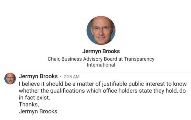 One of the few to break the resounding silence about Shaw’s bogus academic background is Jermyn Brooks, who was Shaw’s boss at PwC and now works at Transparency International.
