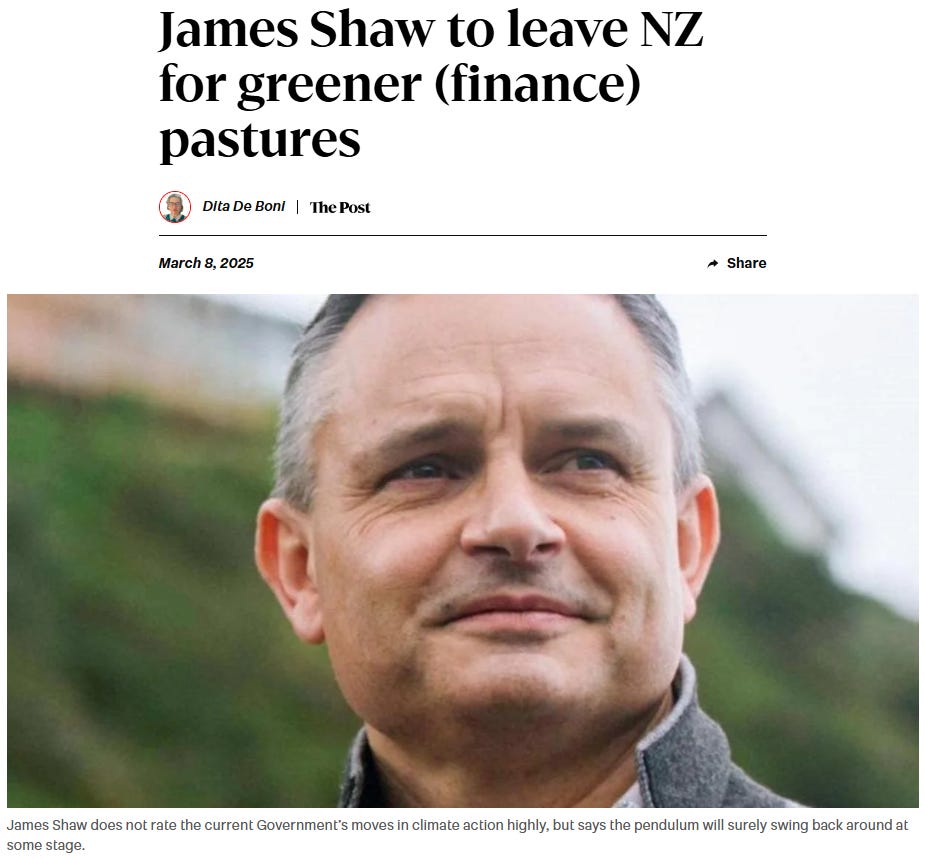 The 8 March 2025 edition of The Post featured a piece by Dita de Boni about former New Zealand Parliamentarian James Shaw. Dita’s Stuff(ed) employer describes her as its “Auckland Business Editor”. Ms de Boni’s unashamedly fawning piece is about Shaw joining the Singapore operations of “Morrison”, a financial firm that runs New Zealand listed infrastructure company, “Infratil”.