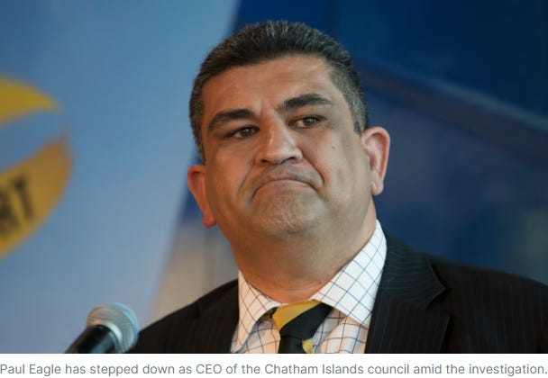 Thirdly, Eagle’s adopted son, Tamarangi, is said to hail from the Chatham Islands, with Ngāti Mutunga o Wharekauri ancestry. There’s a delicious irony here. Ngāti Mutunga is the tribe from North Taranaki that, with adjacent Taranaki tribe Ngāti Tama, commandeered a ship and in 1835 committed a genuine genocide on the original inhabitants of the Chathams, the Moriori people. So, Eagle was regarded as especially qualified for Chathams CEOship because his adopted son is apparently partly descended from people who killed, ate, enslaved and otherwise tried to exterminate the Moriori. I’ve covered this atrocity in a previous Substack.