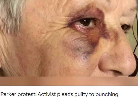The violence included a bearded person in a dress repeatedly punching a 72-year-old in the head, in a vicious unprovoked assault (viewable online). The assault fractured the woman’s eye-socket and left her permanently maimed.